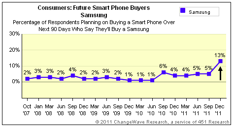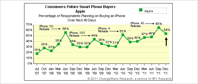 Firma badawcza ChangeWave opublikowała dziś wyniki najnowszych badań z Ameryki Północnej wśród klientów smartfonów pokazujące, że ponad połowa z tych, którzy chcą nabyć smartfona w ciągu najbliższych 90 dni planuje zakup iPhone’a 4S.