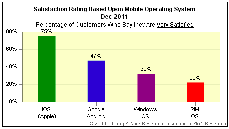 Analizując zadowolenie użytkowników smartfonów z ich posiadanych smartfonów, Apple nadal jest liderem z 75% właścicieli twierdzących, że są „bardzo zadowoleni” z iPhone’a. IPhone w tym badaniu ma stały udział ok 70-80% zadowolonych użytkowników w praktycznie całej historii tego urządzenia. Wśród konkurentów Apple, Android używany m.in. przez Samsunga, HTC i Motorole zanotował 47% stopień satysfakcji. Research in Motion kontynuuje spadek z nowym minimum 22% użytkowników określających się jako bardzo zadowolonych ze swoich urządzeń BlackBerry.