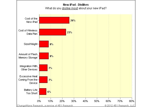 ChangeWave kontunuując w ankiecie temat ciepła, zapytał konkretnie „jak duży – jeśli w ogóle – jest problem nadmiernego ciepła pochodzący z nowego iPada”. 89% respondentów twierdzi, że to żaden problem, albo że nawet tego nie zauważyło. Ani jedna osoba nie uznała go za „bardzo duży problem.”