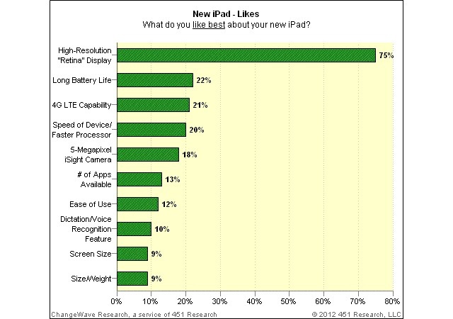 A plusy? Czy wiecie, co najbardziej podoba się właścicielom iPada trzeciej generacji? Tak, to wyświetlacz Retina. Aż 75% badanych mówi, że to ich ulubiona cecha w nowym iPadzie. 22% wymieniło długą żywotność baterii, 21% preferuje obsługę LTE, 20% szybkość urządzenia, a 18% nowy 5MP aparat.