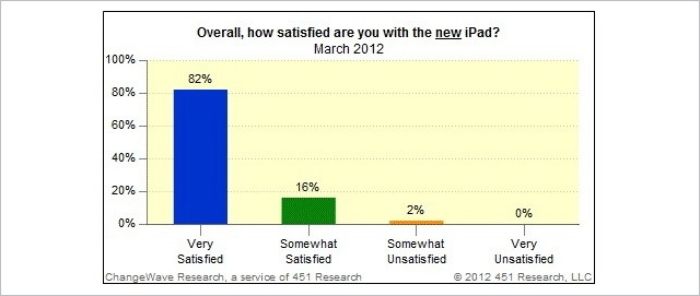 Cóż, znowu to samo. Ludzie uwielbiają nowego iPada. Według sondażu przeprowadzonego przez ChangeWave, 82% respondentów stwierdziło, że jest „bardzo zadowolonych” z nowego iPada. Dodając do tego procent „tak jakby zadowolonych” (16%) dostajemy 98% ocen satysfakcjonujących. Nieźle, prawda?