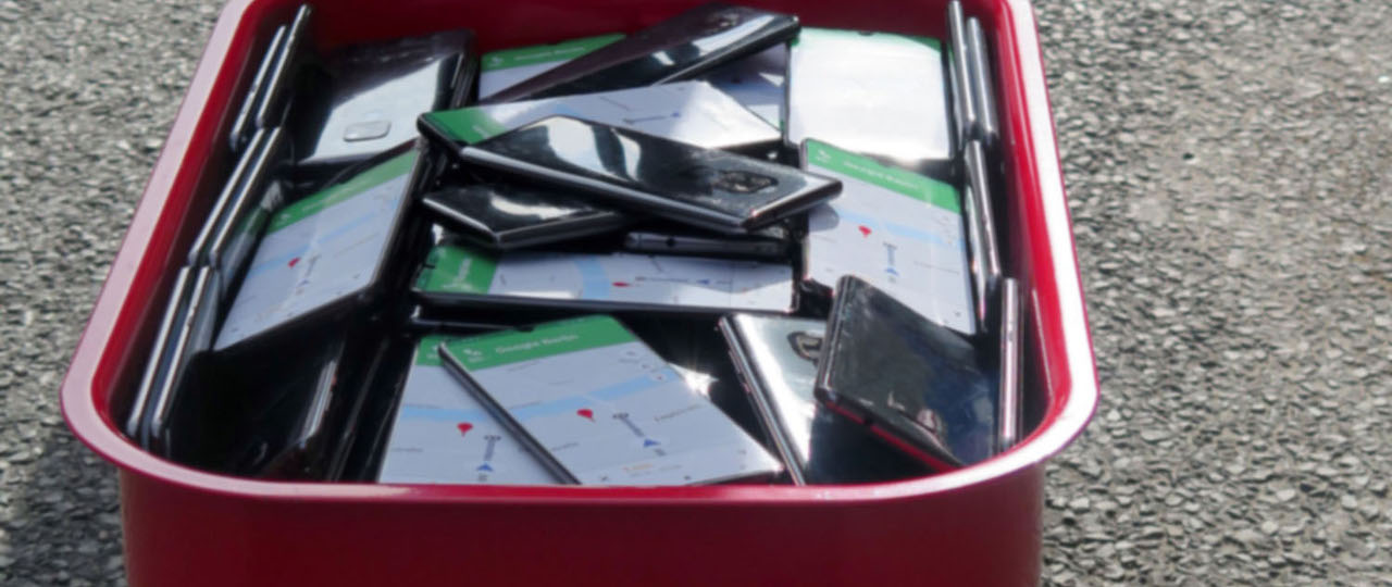 99 smartfonów przewożonych wózkiem ręcznym w celu generowania wirtualnego korku w Mapach Google. Dzięki tej czynności można zmienić kolor zielonej ulicy na czerwoną, co ma wpływ na świat fizyczny, nawigując samochody po innej trasie, w celu uniknięcia utknięcia w korku.