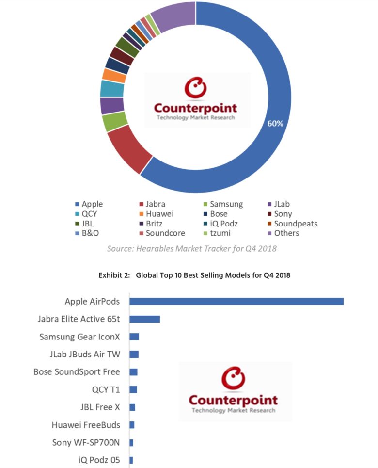 Słuchawki AirPods to nie tylko wielki hit dla Apple, ale także zwycięzca na rynku „bezprzewodowych słuchawek”. Według nowych badań przeprowadzonych przez Counterpoint, AirPods stanowiły 60 procent całego rynku w IV kwartale 2018 roku.