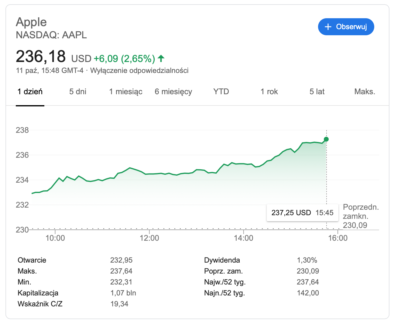 Akcje Apple osiągnęły dziś wartość powyżej 234 dolarów ustanawiając tym samym nowy rekord w historii firmy. Jak zauważyło CNBC, poprzedni rekordowy rekord wynosił 233,47 dolarów i padł w październiku 2018 roku.