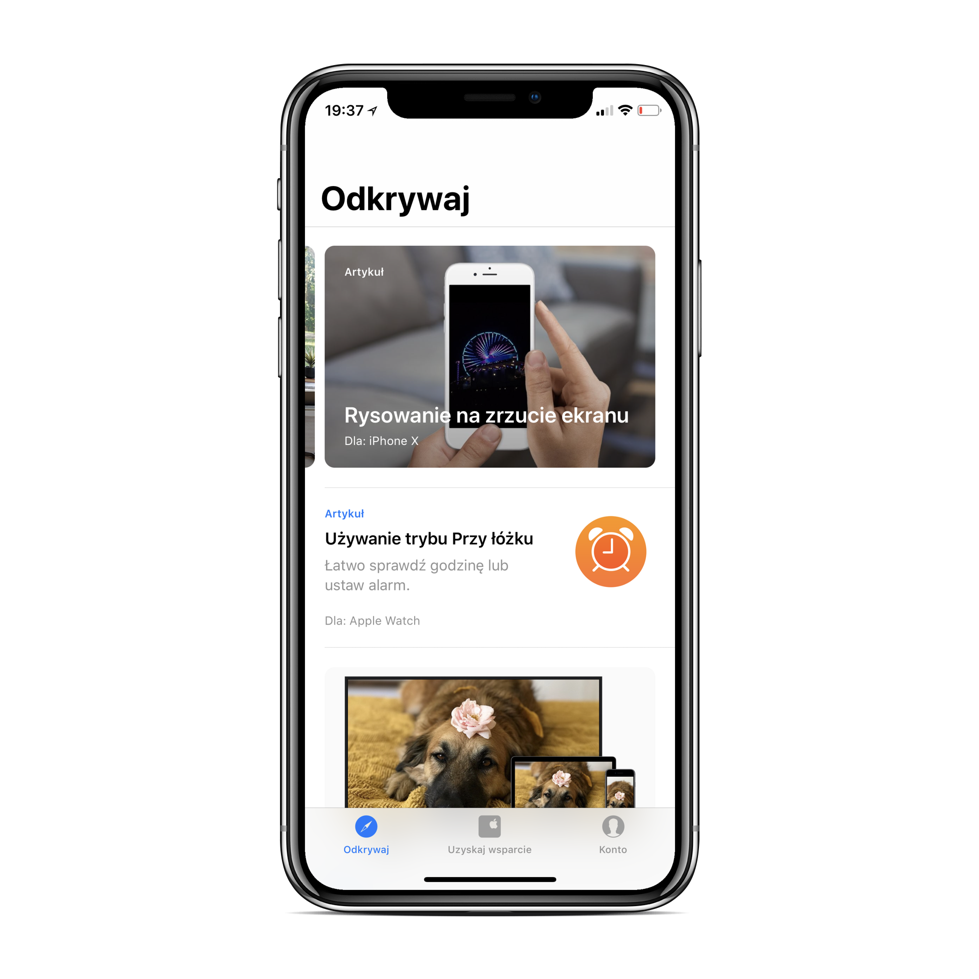 W aplikacji dostępna jest również przydatna sekcja Odkrywaj, w której można znaleźć szybkie porady i wskazówki dotyczące np. korzystania z aplikacji Pliki czy korzystania z funkcji Face ID.