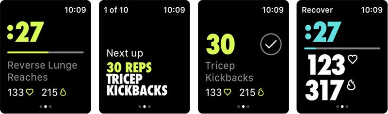 Treningi można rozpoczynać w aplikacji na iPhone’a, a następnie aplikacja Apple Watch pozwala użytkownikom łatwo sprawdzić ilość czasu lub powtórzeń pozostałych do wykonania ćwiczenia. Użytkownicy zegarka Apple Watch otrzymają także informacje zwrotne podczas ćwiczeń.