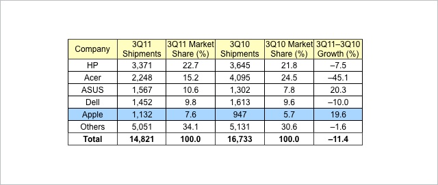 Firma badawcza Gartner opublikowała swoje kwartalne szacunki sprzedaży komputerów w Europie Zachodniej w trzecim kwartale 2011 roku, uznając, że Apple wbrew ogólnym tendencjom na rynku spadkowym dołączył do listy pięciu największych producentów.