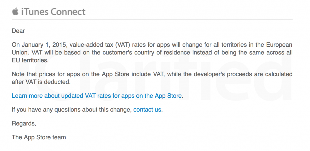 Apple wysłał e-mail do zarejestrowanych deweloperów aplikacji zapowiadając nadchodzące zmiany opodatkowania App Store na rynkach europejskich. Rozpoczynając od 1 stycznia 2015 roku, Apple rozpocznie naliczanie klientom ustalonego dla danego kraju podatku od wartości dodanej (VAT), a nie tej samej stawki we wszystkich krajach Unii Europejskiej, jak to miało miejsce do tej pory.