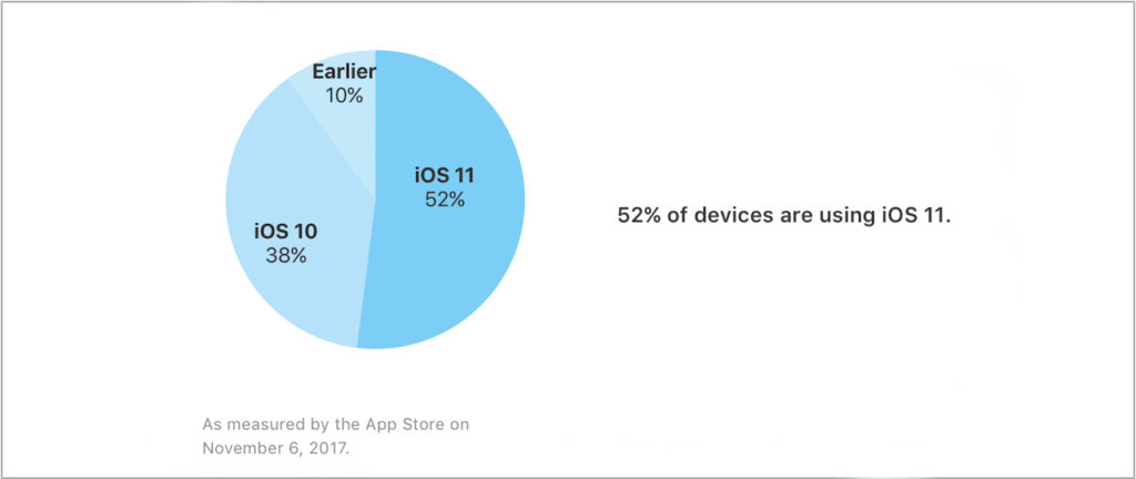 Po zainstalowaniu iOS 11 na 52 procentach urządzeń, 38 procent nadal działa na systemie iOS 10, 10 procent urządzeń nadal uruchamianych jest na wcześniejszej wersji iOS.