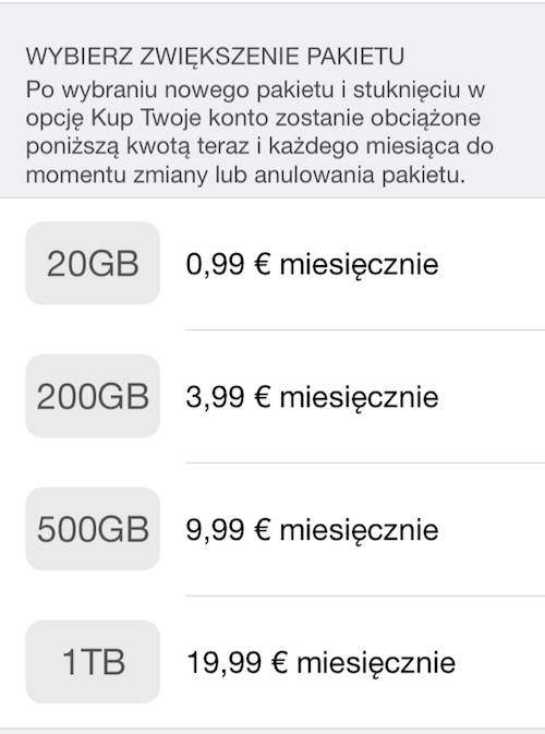 Użytkownicy mogą teraz dostać 20 GB przestrzeni za 0,99 EUR miesięcznie, 200 GB miejsca za 3,99 EUR miesięcznie, 500 GB miejsca za 9,99 EUR miesięcznie i 1 TB miejsca za 19,99 EUR miesięcznie. Zwiększenie pakietów iCloud można dokonać wchodząc w iCloud w Ustawienia —> dysk i archiwum —> zmień pakiet dyskowy.