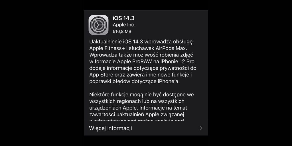 Uaktualnienie iOS 14.3 wprowadza obsługę Apple Fitness+ i słuchawek AirPods Max. Wprowadza także możliwość robienia zdjęć w formacie Apple ProRAW na iPhonie 12 Pro, dodaje informacje dotyczące prywatności do App Store oraz zawiera inne nowe funkcje i poprawki błędów dotyczące iPhone’a.