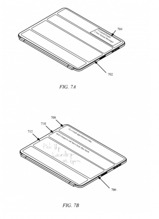 Wreszcie, jedna z wersji patentu pokazuje osadzony na zewnątrz Smart Cover wyświetlacz, który może zaoferować informacje, takie jak powiadomienia i przypomnienia bez konieczności otwierania pokrywy i włączania urządzenia. Firma Apple może także integrować sekcję, która pozwoli użytkownikom na szybkie, własne notatki na okładce.