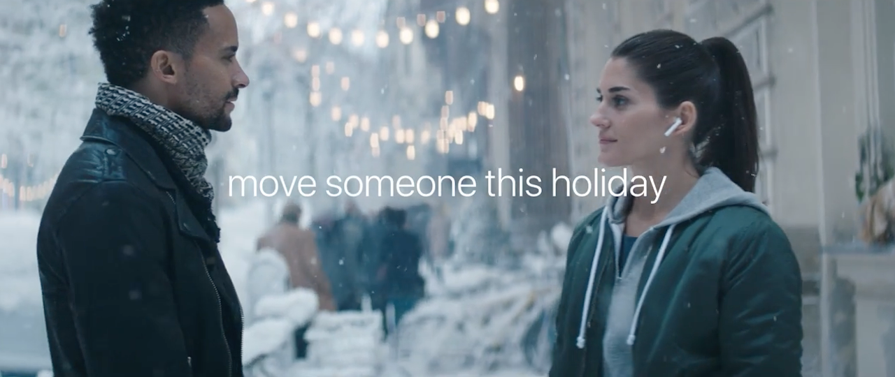 Reklama, w której zaprezentowany jest zarówno iPhone X, jak i słuchawki AirPods, pokazuje kobietę tańczącą w zaśnieżonym mieście w rytmie piosenki „Palace” Sam Smith. Spotyka ona swojego partnera, z którym dzieli się jedną słuchawką AirPods zaczynając wspólnie tańczyć.
