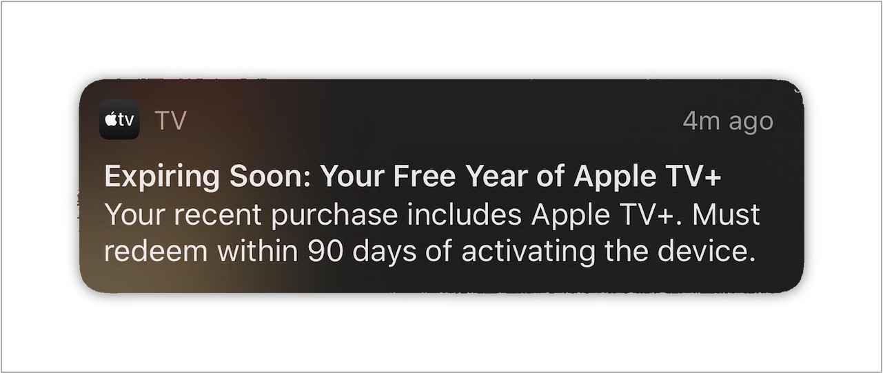 Apple rozpoczął wysyłanie powiadomień uprawnionym użytkownikom z przypomnieniami o możliwości wykorzystania bezpłatnego roku na subskrypcję Apple TV+, tym którzy jeszcze tego nie zrobili.