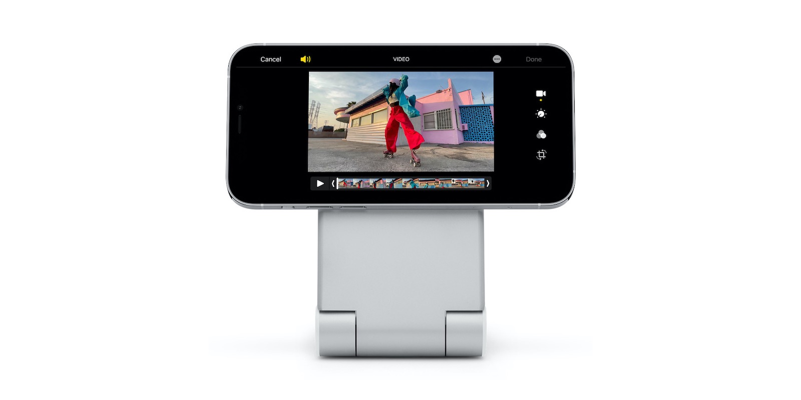 Składana podstawka może się świetnie sprawdzić w podróży i pozwala ustawić żądany kąt do oglądania na stoliku nocnym, połączeń wideo i nie tylko w orientacji pionowej lub poziomej. Po całkowitym złożeniu do pozycji poziomej może służyć jako tradycyjna ładowarka Qi do urządzeń innych niż MagSafe, takich jak AirPods lub inne smartfony.
