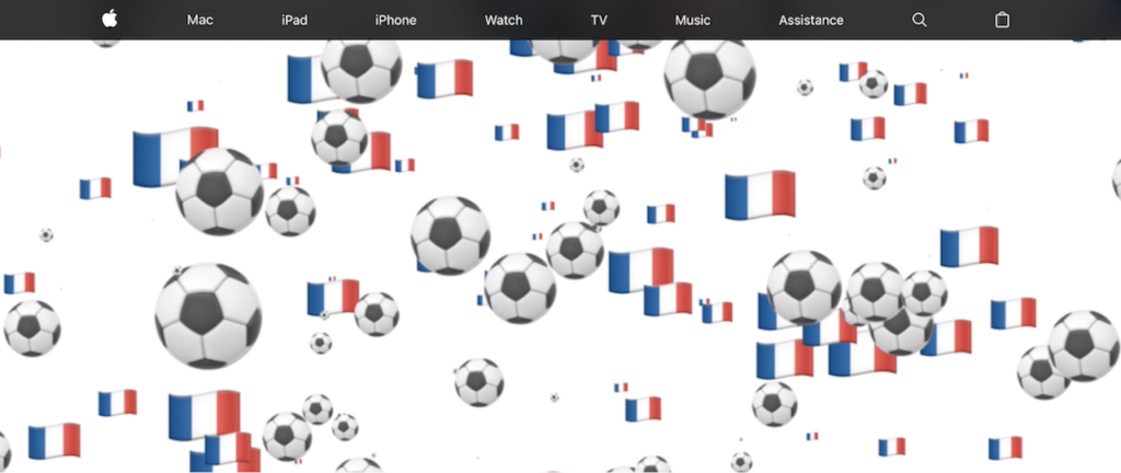 Strona internetowa firmy Apple we Francji odtwarza 3-sekundowe wideo przedstawiające pływające piłki i flagę francuską. Po jednokrotnym odtworzeniu filmiku pojawia się tradycyjna strona główna Apple. Dla chorwackich fanów główna strona Apple ma podobny akcent, aczkolwiek bez chorwackiej flagi. Zamiast tego widzimy emotikony ognia i serc, a także piłek pływające po witrynie.