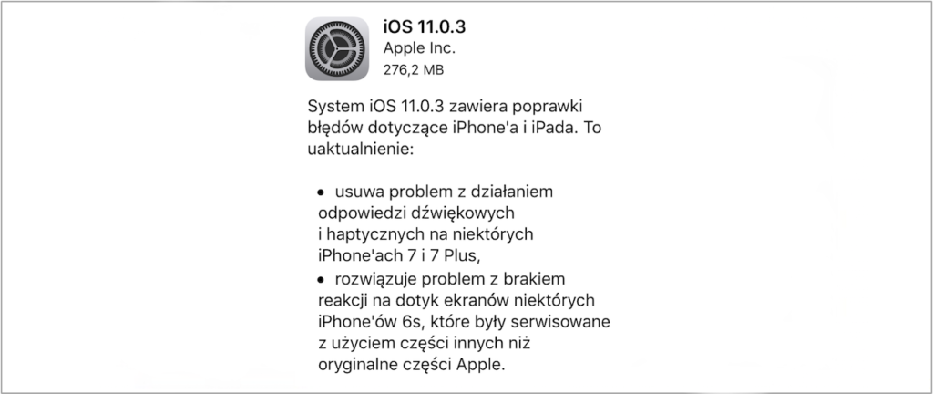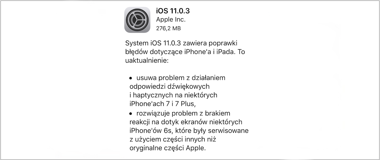 Dzisiejsza aktualizacja dotyczy błędów i problemów, które zostały wykryte po wydaniu iOS 11.0.2. Zgodnie z informacjami o wersji pakietu Apple aktualizacja rozwiązuje problemy dotyczące odpowiedzi dzwiękowych i haptycznych i ekranu dotykowego.
