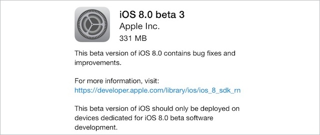 Firma Apple wydała dziś trzecią wersję beta iOS 8 dla deweloperów, trzy tygodnie po uwolnieniu drugiej wersji beta i ponad miesiąc od odsłonięcia nowego systemu operacyjnego podczas Worldwide Developers Conference.