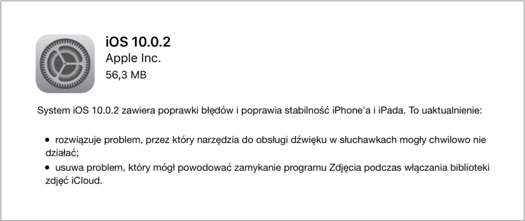 Dzisiejsza aktualizacja zawiera poprawki kilku drobnych błędów, które zostały wykryte po wydaniu systemu operacyjnego. System iOS 10.0.2 zawiera poprawki błędów i poprawia stabilność iPhone’a i iPada. To uaktualnienie rozwiązuje problem, przez który narzędzia do obsługi dźwięku w słuchawkach mogły chwilowo nie działać oraz usuwa problem, który mógł powodować zamykanie programu Zdjęcia podczas włączania biblioteki zdjęć iCloud.