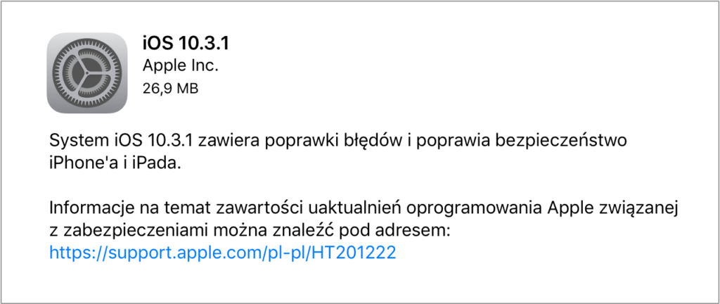 Zgodnie z informacjami o wersji Apple iOS 10.3.1 zawiera poprawki błędów i poprawia bezpieczeństwo iPhone’a lub iPada. Notatki nie zawierają szczegółowych informacji na temat poprawek błędów lub ulepszeń zabezpieczeń dostępnych w tej wersji, więc zaktualizujemy ten wpis jeśli dowiemy się więcej o zawartości aktualizacji iOS 10.3.1.