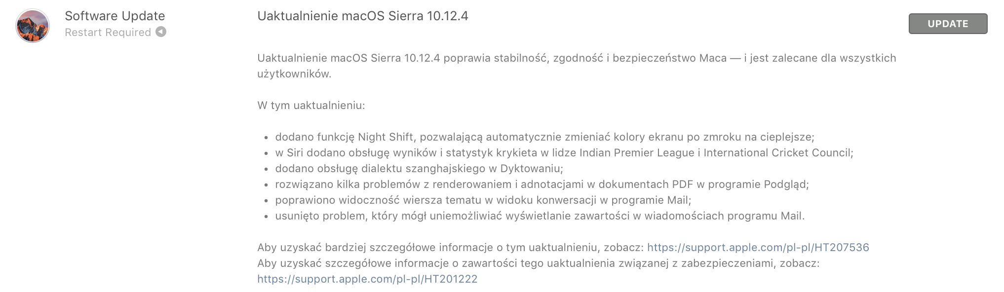 MacOS Sierra 10.12.4 to bezpłatna aktualizacja dla wszystkich użytkowników, którzy posiadają system macOS Sierra. Aktualizację można pobrać korzystając z funkcji aktualizacji oprogramowania w Mac App Store.