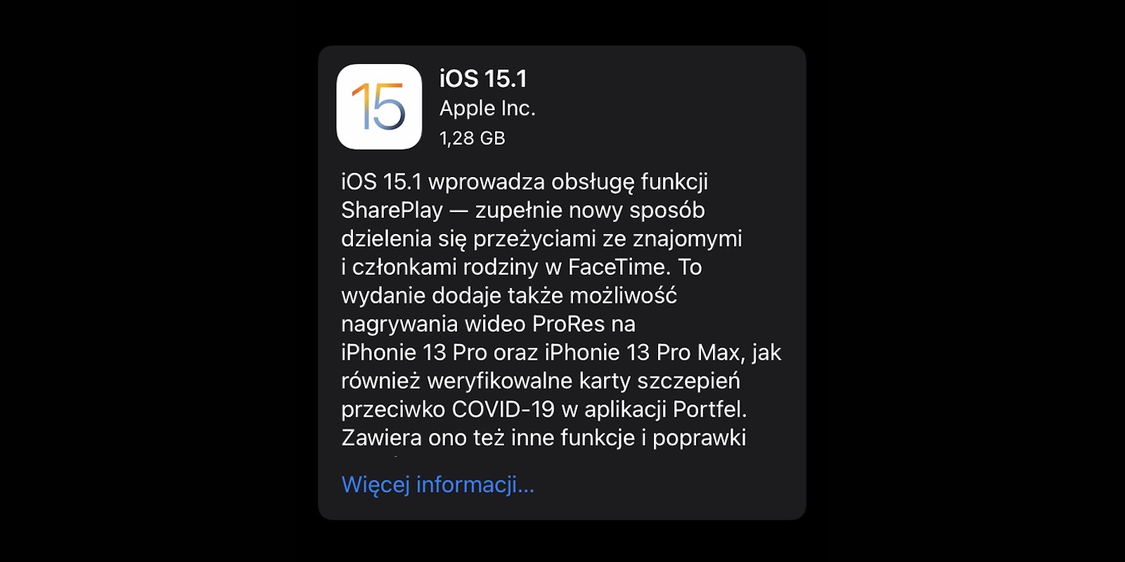 iOS 15.1 wprowadza obsługę funkcji SharePlay — zupełnie nowy sposób dzielenia się przeżyciami ze znajomymi i członkami rodziny w FaceTime. To wydanie dodaje także możliwość nagrywania wideo ProRes na iPhonie 13 Pro oraz iPhonie 13 Pro Max, jak również weryfikowalne karty szczepień przeciwko COVID-19 w aplikacji Portfel. Zawiera ono też inne funkcje i poprawki błędów dla iPhone’a.