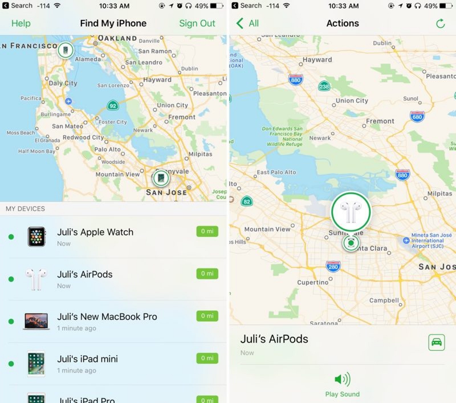 Jako większa aktualizacja iOS 10.3 wprowadza nową opcję „Znajdź moje AirPods”, aby pomóc użytkownikom zlokalizować zgubione słuchawki AirPods. Dodana do aplikacji „Find My Friends” funkcja „Find My AirPods” posiada możliwość pokazania ostatniej znanej lokalizacji, w której AirPods były podłączone do urządzenia iOS poprzez Bluetooth i pozwala na odtworzenie dźwięku przez AirPods, aby ich odnalezienie było łatwiejsze.