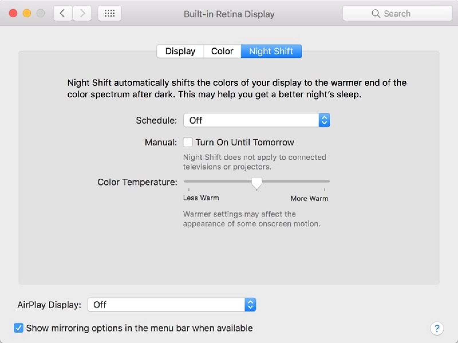 MacOS Sierra 10.12.4 wprowadza popularny tryb Night Shift z iOS na Mac, dzięki czemu użytkownicy mogą obniżyć ekspozycję światła niebieskiego na swoich ekranach. Uważa się, że niekorzystnie wpływa ono na sen przez naruszanie rytmu dobowego organizmu, a niebieskie światło jest uważane za bardziej szkodliwe niż światło żółte.