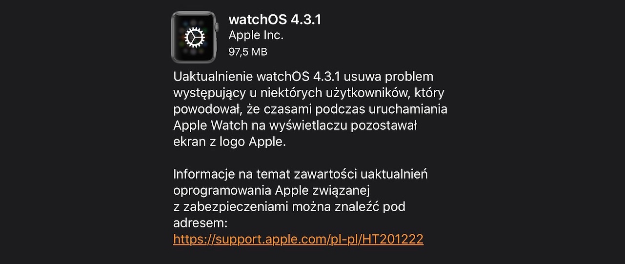 WatchOS 4.3.1 można pobrać przez dedykowaną aplikację Watch na iPhone’ie, przechodząc do Ogólne -> Uaktualnienia. Aby zainstalować nowe oprogramowanie, Apple Watch musi mieć co najmniej 50 procent baterii, musi być umieszczony na ładowarce i musi znajdować się w zasięgu iPhone’a.