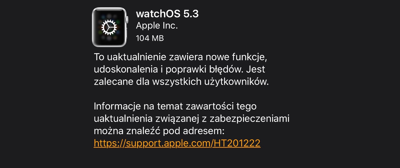 WatchOS 5.3 można pobrać za darmo z dedykowanej aplikacji Watch na iPhone’ie, przechodząc do zakładki Ogólne -> Uaktualnienia. Aby zainstalować nowe oprogramowanie, Apple Watch musi mieć co najmniej 50 procent baterii, musi być umieszczony na ładowarce i musi znajdować się w zasięgu iPhone’a.