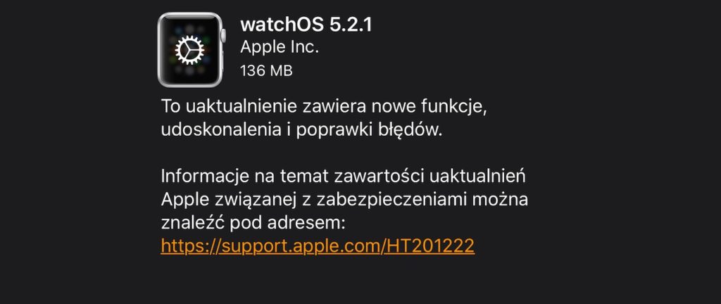 Aktualizacja watchOS 5.2.1 jest niewielka i skupia się na poprawie wydajności i poprawkach błędów wykrytych od czasu wydania watchOS 5.2. Nie zaobserwowano żadnych zmian w funkcjach podczas okresu testowego beta watchOS 5.2.1. Dla nas jednak ma jedną, długo oczekiwaną funkcję. Wprowadza na Apple Watch Serii 4 funkcję EKG dla polskich użytkowników. Od dziś oficjalnie możemy otrzymywać powiadomienia o nieregularnym rytmie serca. Poza Polską funkcja ta dostępna jest również w Chorwacji, Czechach, Islandii i na Słowacji.