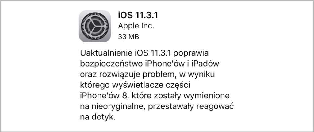 Uaktualnienie iOS 11.3.1 poprawia bezpieczeństwo iPhone’ów i iPadów oraz rozwiązuje problem, w wyniku którego wyświetlacze części iPhone’ów 8, które zostały wymienione na nieoryginalne, przestawały reagować na dotyk.