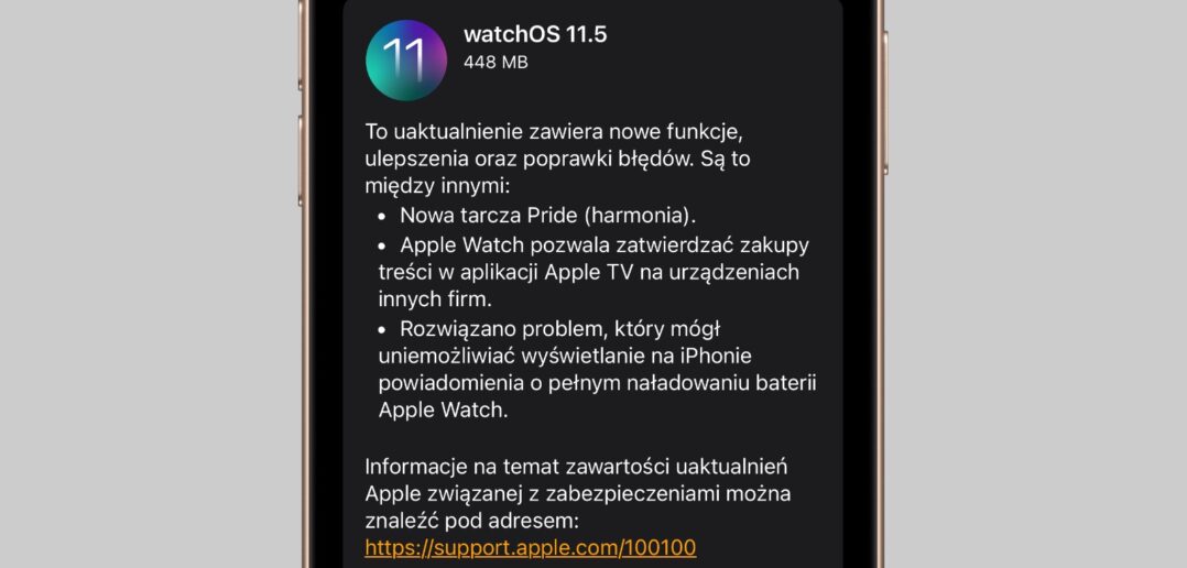 Aktualizacja watchOS 11.5 dodaje nową tarczę zegarka Pride i naprawia problem, który mógł uniemożliwiać wyświetlanie na iPhonie powiadomienia, że bateria Apple Watch jest w pełni naładowana. Poniżej znajdują się pełna informacje dodana do aktualizacji.