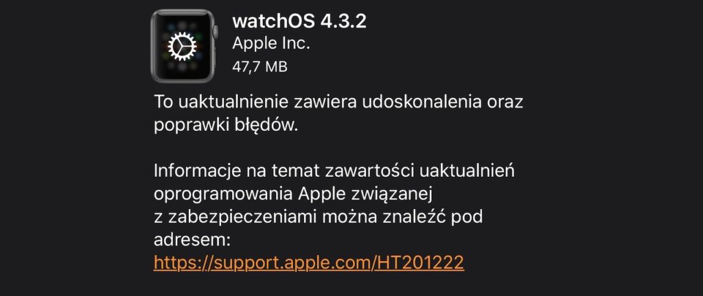 WatchOS 4.3.2 można pobrać przez dedykowaną aplikację Watch na iPhone’ie, przechodząc do Ogólne -> Uaktualnienia. Aby zainstalować nowe oprogramowanie, Apple Watch musi mieć co najmniej 50 procent baterii, musi być umieszczony na ładowarce i musi znajdować się w zasięgu iPhone’a.