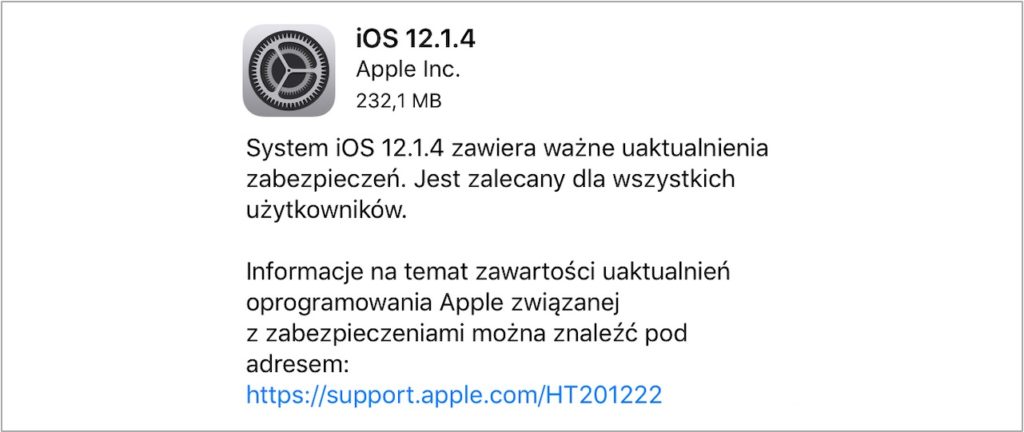 Nowe oprogramowanie iOS 12.1.4 można pobrać na wszystkie odpowiednie urządzenia za pośrednictwem sieci bezprzewodowej, korzystając z aplikacji Ustawienia. Aby go pobrać, wybierz Ustawienia -> Ogólne -> Uaktualnienia.