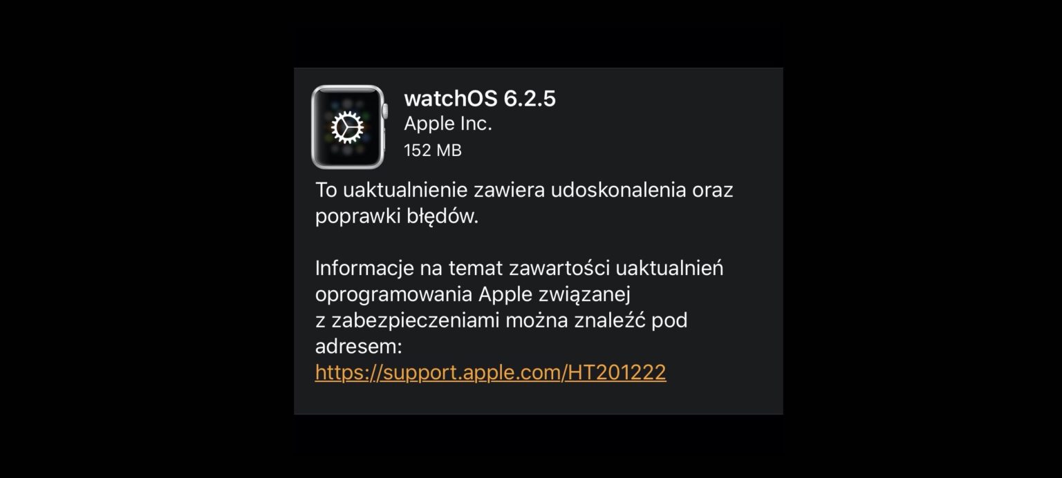 System watchOS 6.2.5 można pobrać bezpłatnie za pośrednictwem dedykowanej aplikacji Watch na iPhone’a, przechodząc do opcji Ogólne> Uaktualnienia. Aby zainstalować nowe oprogramowanie, Apple Watch musi mieć co najmniej 50 procent baterii, musi być umieszczony na ładowarce i musi znajdować się w zasięgu iPhone’a.