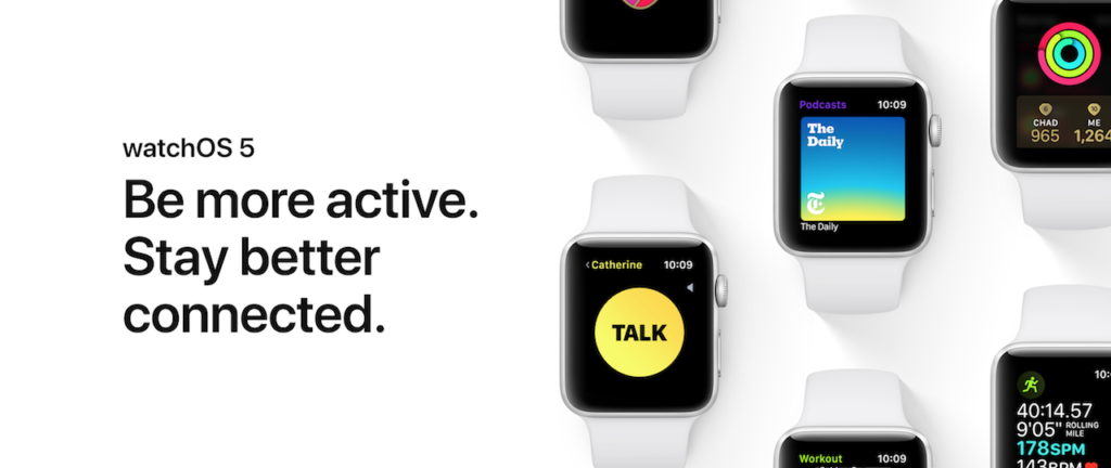 Do watchOS 5 dodaną nową aplikację Walkie-Talkie umożliwiającą użytkownikom wysyłanie wiadomości typu „naciśnij i mów” z zegarka do zegarka, choć sądzę że będzie ona dostępna tylko w modelach LTE niedostępnych wciąż w Polsce. Dodano możliwość słuchania Podcastów. Dzięki temu subskrybowane podcasty będą automatycznie synchronizowane z urządzeniem w celu słuchania ich w trybie offline, a muzyka i książki audio z aplikacji takich jak Pandora i Audible będą synchronizowane z Apple Watch również w trybie offline.