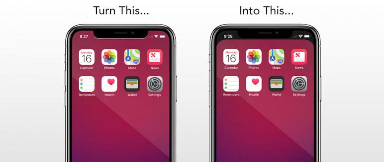 Rezultat ukrywa istnienie wycięcia i sąsiadujących „uszu” za pomocą czegoś co wygląda jak solidny czarny pasek stanu u góry ekranu blokady i ekranu głównego.
