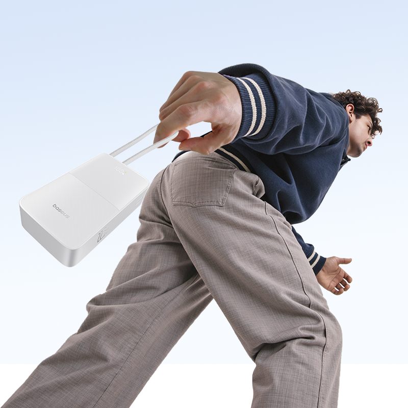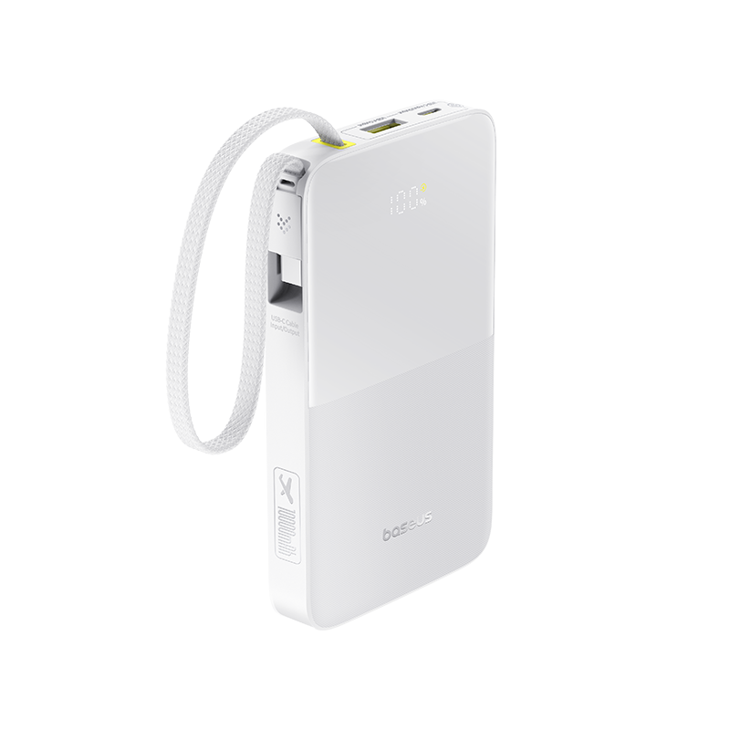 Jedną z największych zalet nowego modelu jest wbudowany, pleciony kabel USB-C o długości 22 cm – elastyczny, odporny na przetarcia, zginanie i skręcanie. Przeszedł testy wytrzymałościowe w laboratoriach Baseus, gdzie ponad 10 000 razy był zwijany i rozwijany – bez utraty funkcjonalności.