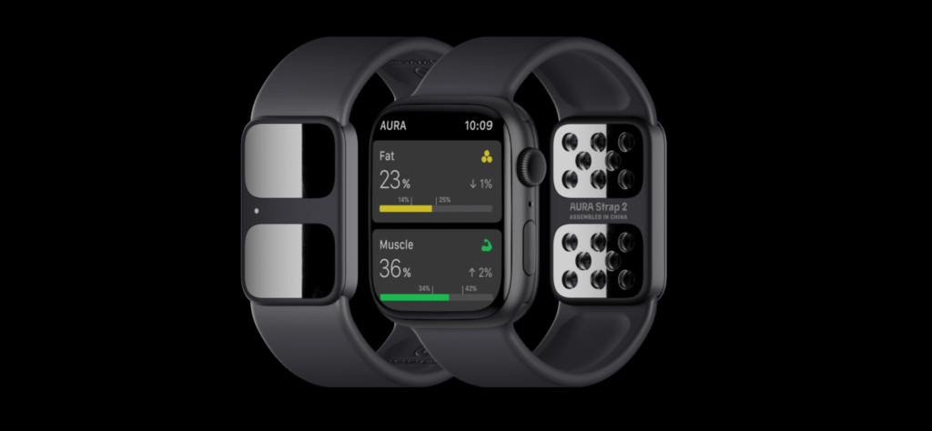 Aura Strap, którego cena wynosi 99 dolarów pozwala użytkownikom mierzyć skład ciała i śledzić poziom nawodnienia i postępy fitness. Aura mówi, że pasek wykorzystuje bioimpedancję do analizy górnej części ciała, śledzenia wydajności płuc i zmian w oddychaniu, porównując te informacje z danymi pulsu.
