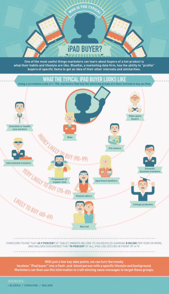 Okazuje się że najbardziej charakterystycznym dla kupujących iPada jest: płeć męska, właściciel zwierzaka i fan gier wideo. Kolejne cechy charakterystyczne to: osoby będące naukowcami lub turystami i co najdziwniejsze zwolennicy żywności ekologicznej.