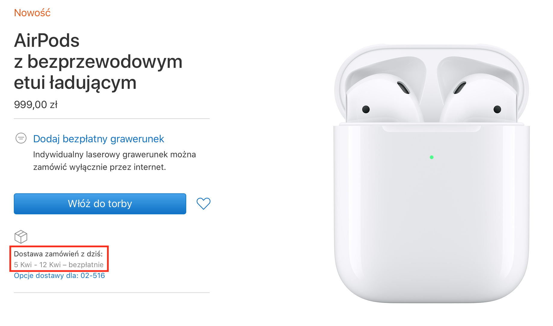Jeszcze wczoraj Apple podawał szacunkowy czas dostawy słuchawek z etui do ładowania bezprzewodowego 27-29 marca. Dziś ta data przesunęła się do 5-12 kwietnia. Druga generacja AirPods ze standardowym etui do ładowania wciąż jest dostępna od 27 marca do 29 marca, podobnie jak samodzielne etui do ładowania bezprzewodowego wprowadzone dla posiadaczy pierwszej generacji słuchawek.
