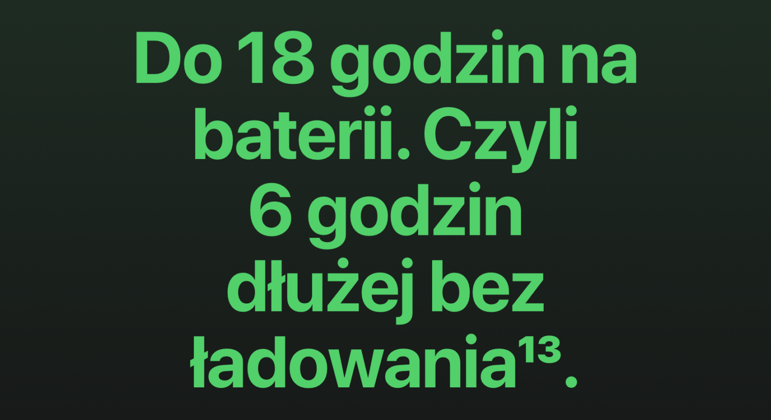 Bateria w nowym MacBooku Air (49,9 Wh) zapewnia do 15 godzin bezprzewodowego przeglądania Internetu i do 18 godzin oglądania filmów przy użyciu aplikacji Apple TV. Model poprzedniej generacji działał do 11 godzin podczas przeglądania sieci lub do 12 godzin podczas oglądania filmów.