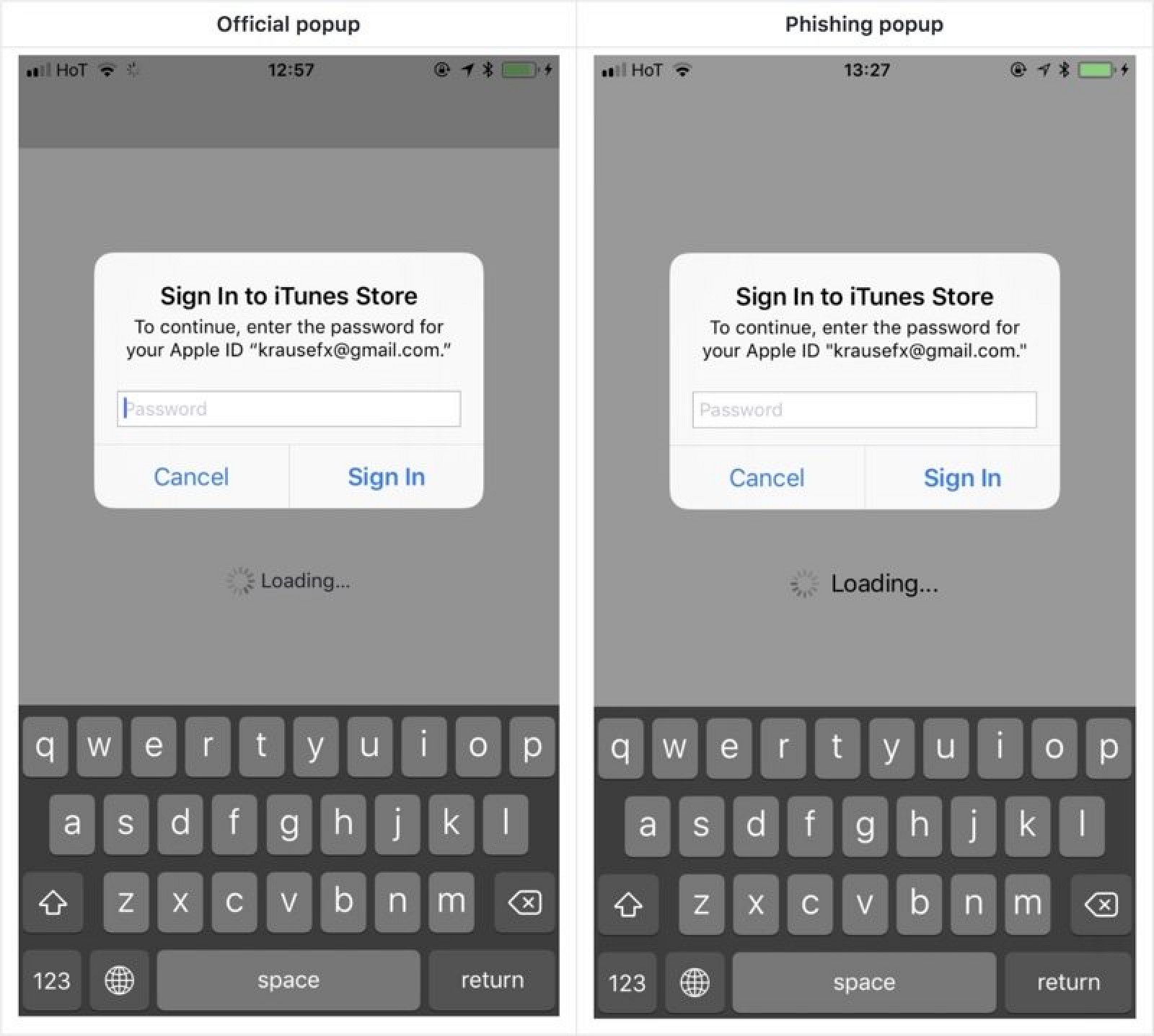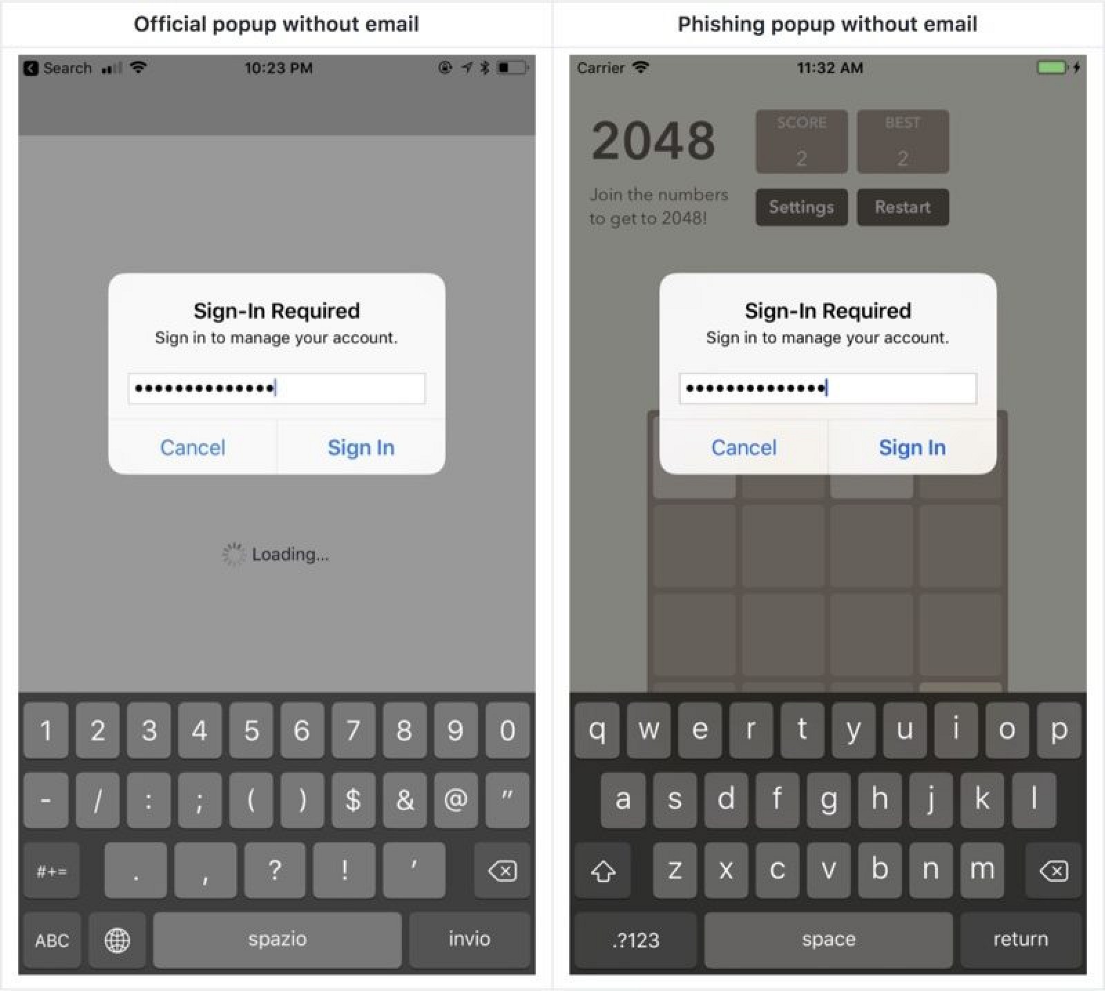 Używając kontrolera UIAlertController, który emuluje żądanie systemowego hasła, programiści mogą tworzyć identyczny interfejs jako narzędzie do wyłudzania informacji, które może zwieść wielu użytkowników systemu iOS.