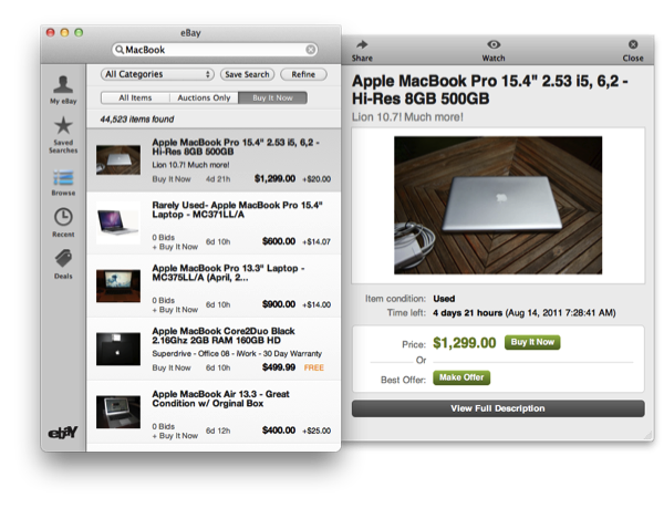 Jeżeli męczy Cię ciągłe logowanie na stronie eBay w poszukiwaniu kolejnej superokazji? Sprawdź to – serwis aukcyjny eBay wypuścił do Mac App Store’a aplikację na pierwszy rzut oka bardzo podobną do istniejących Macowych Sparrow i Twitter, ułatwiającą licytację produktów bezpośrednio z Twojego komputera. Ten mały i bardzo ładnie wyglądający programik pozwala śledzić obserwowane aukcje, historię licytacji, składać ofertę, przeszukiwać aukcje i robić wszystko to co na tradycyjnej stronie serwisu eBay. Ta mała kompaktowa konsola dostępu do eBay może być bardzo dobrym zamiennikiem dla tradycyjnej strony.