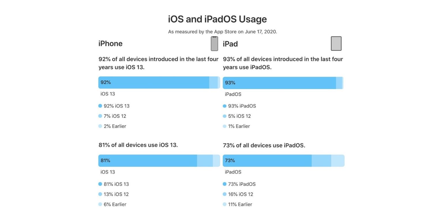 Licząc wszystkie iPady funkcjonujące w użyciu, 73 procent działa na iPadOS 13, 16 procent na iOS 12, a 11 procent na wcześniejszej wersji iOS.