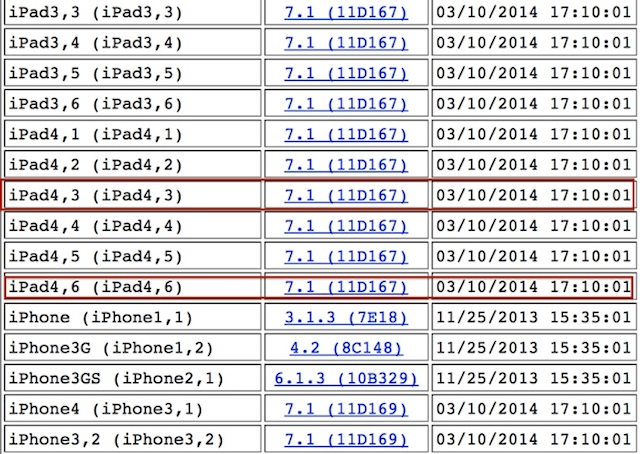 iOS 7.1 wydany wcześniej w dniu dzisiejszym, zawiera wsparcie dla istniejących modeli iPada wraz z obsługą dwóch niezapowiedzianych jeszcze modeli, oznaczonych jako iPad4,3 i iPad4,6. Jest możliwe, że to nowe numery modeli zawierających drobne zmiany sprzętowe dla istniejących iPadów, które zostaną wprowadzone na rynek w milczeniu, gdyż bardziej znaczące ulepszenie czy nowe modele wprowadzone byłyby z numerem wyżej.