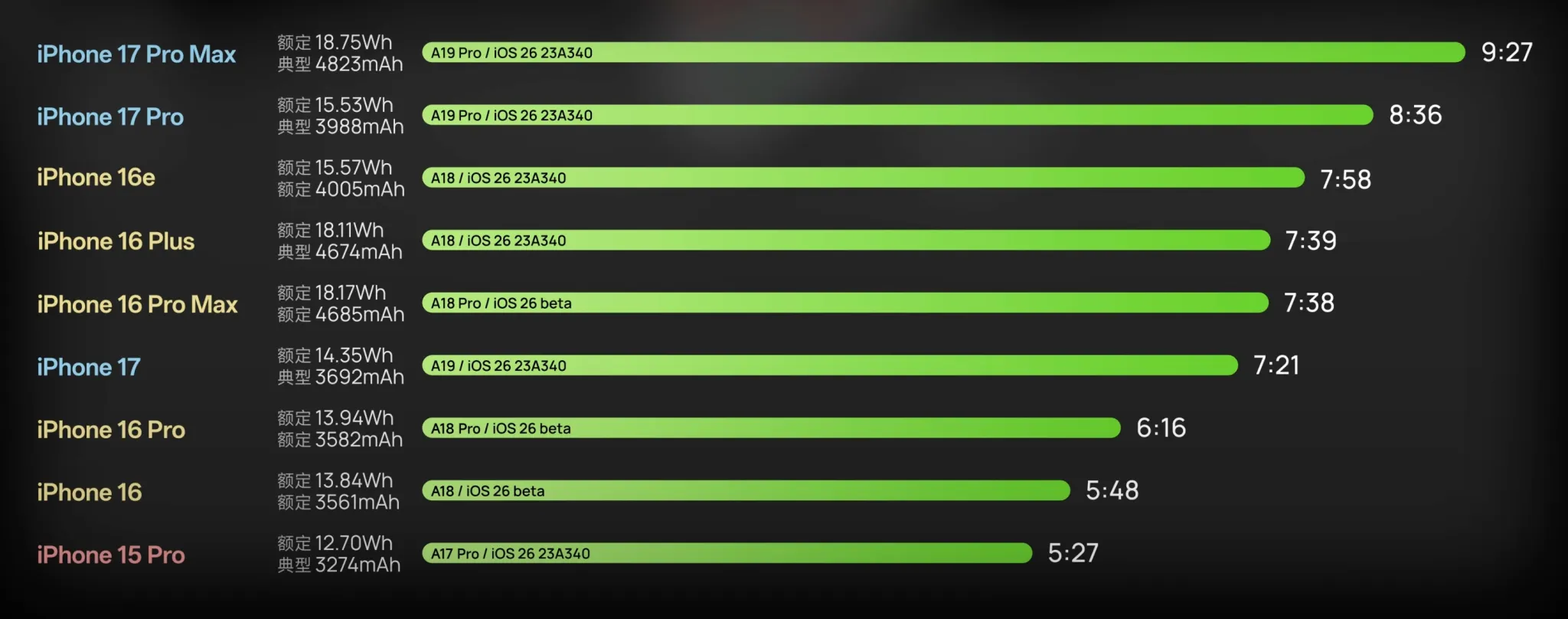 Podobne badanie przeprowadził chiński dziennikarz technologiczny Geekerwan, który potwierdził jeszcze większy skok wydajności w modelach z tacką na fizyczną kartę SIM. Według jego ustaleń, iPhone 17 Pro Max działał prawie dwie godziny dłużej niż 16 Pro Max, a nawet podstawowy iPhone 17 niemal dorównał poprzedniemu flagowcowi pod względem wytrzymałości baterii.