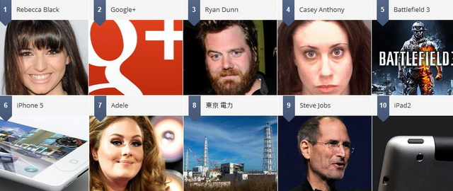 Za Rebeccą Black znalazł się serwis Google +, który tylko w trzy tygodnie od uruchomienia zyskał 10 mln użytkowników. Kolejne miejsca przypadły wydarzeniom tragicznym. Pierwsze związane jest ze śmiercią jednego z bohaterów kultowego programu telewizyjnego „Jackass” Ryana Dunna, który w czerwcu zginął w wypadku samochodowym w wieku 34 lat. Drugie firmuje nazwisko Casey Anthony, która została oskarżona o zabicie swojej dwuletniej córki. W lipcu sąd uniewinnił matkę.