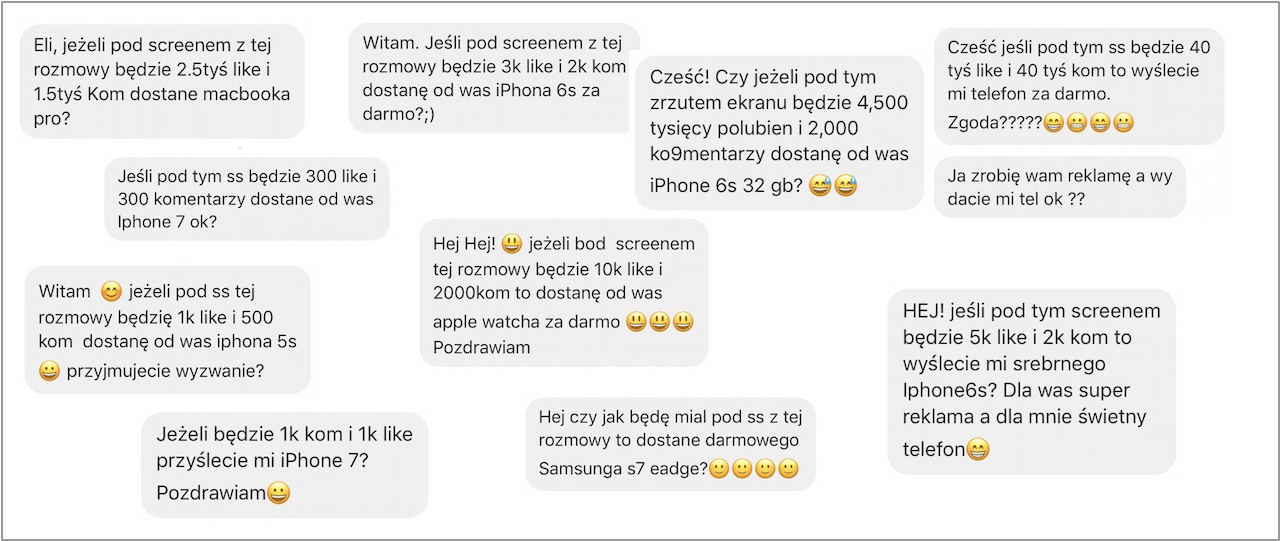 Dlatego też podsumowując temat chciałbym oficjalnie powiedzieć, że nie biorę udziału w żadnych wyzwaniach i mój portal nie będzie rozdawał ani iPhone’ów, ani MacBooków, ani Apple Watch. Po prostu. Bo like to nie waluta. Nie chcę blokować możliwości pisania do mnie wiadomości przez FanPage ponieważ wiele osób zwraca się do mnie z różnymi problemami, które staram się rozwiązywać. Po prostu darujcie sobie wyzwania.